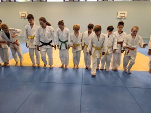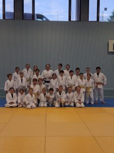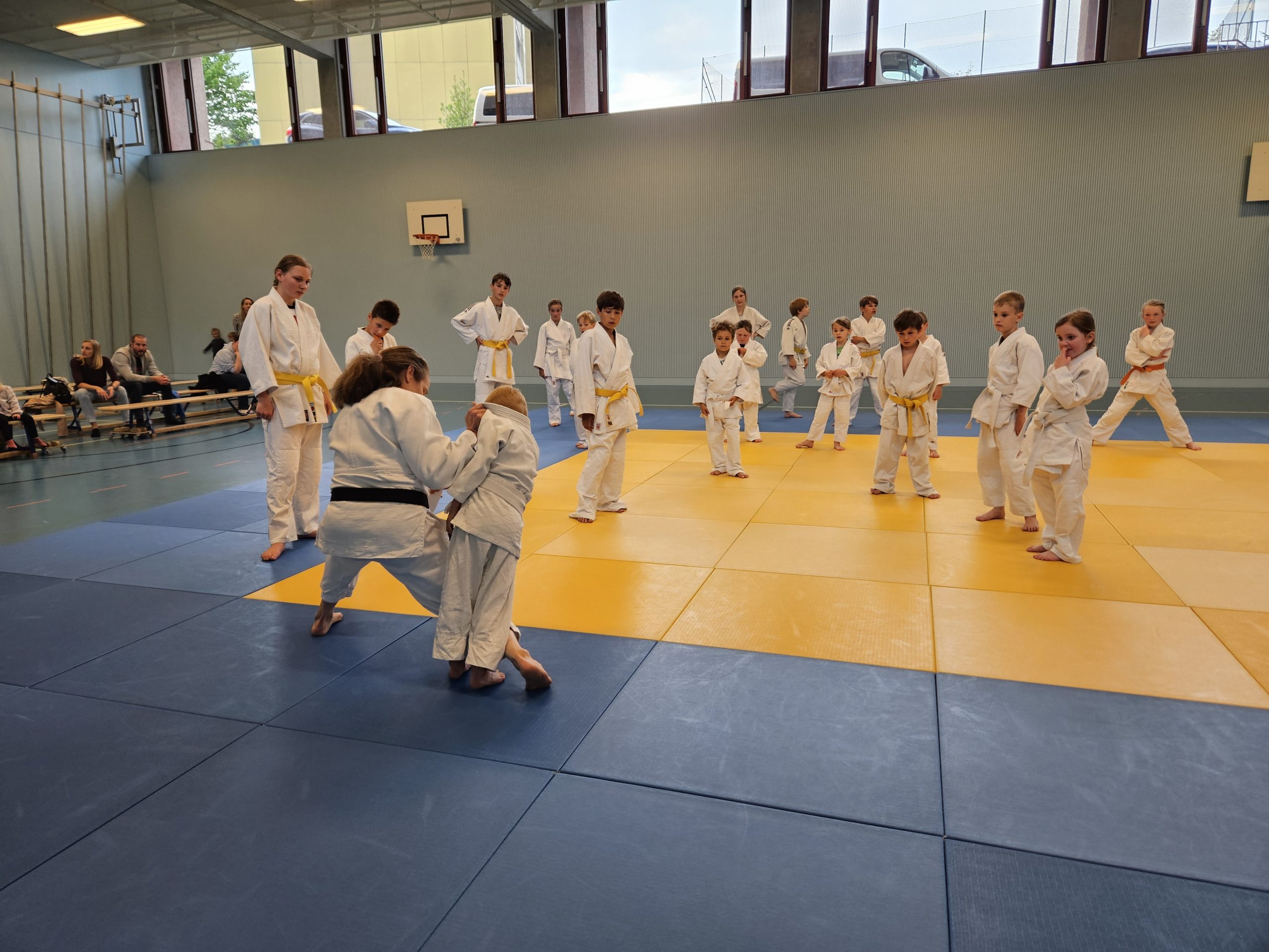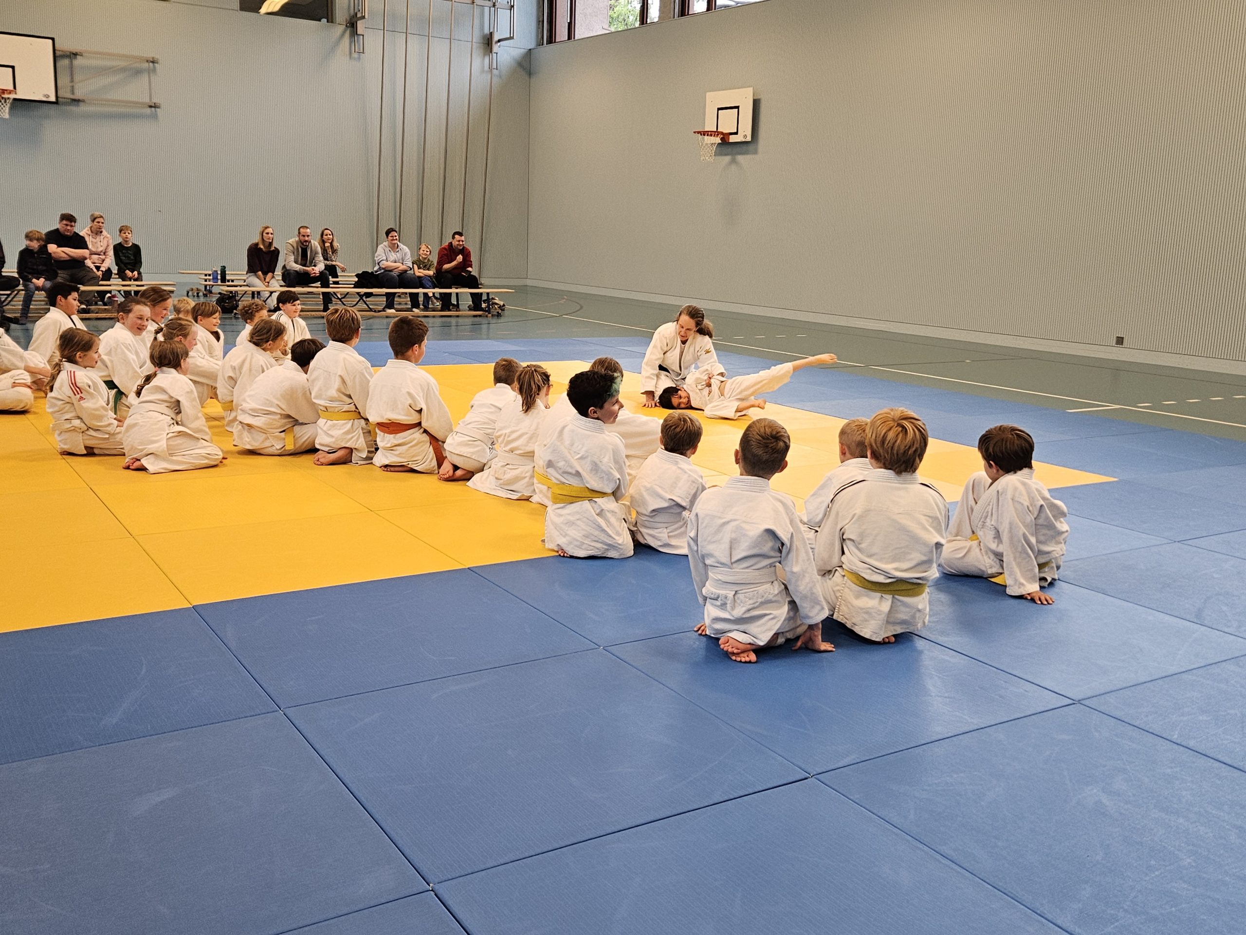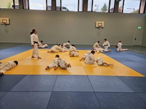 Insgesamt 26 Kinder nahmen am ersten Training des Abends teil. Nach einem spielerischen Aufwärmen leitete Jenny die jungen Judokas schrittweise durch die Technik des Tai-otoshi. Nach einer kurzen Trinkpause ging es mit einer Bodentechnik weiter, bei der eine Drehtechnik und eine Festhalteposition im Fokus standen. Zum Abschluss der eineinhalbstündigen Einheit durften sich die Kinder in verschiedenen Randoris messen. Nach dem offiziellen Teil gab es einige Informationen, ein gemeinsames Gruppenfoto und natürlich eine verdiente Stärkung mit Kuchen und Getränken für Kinder und Eltern.